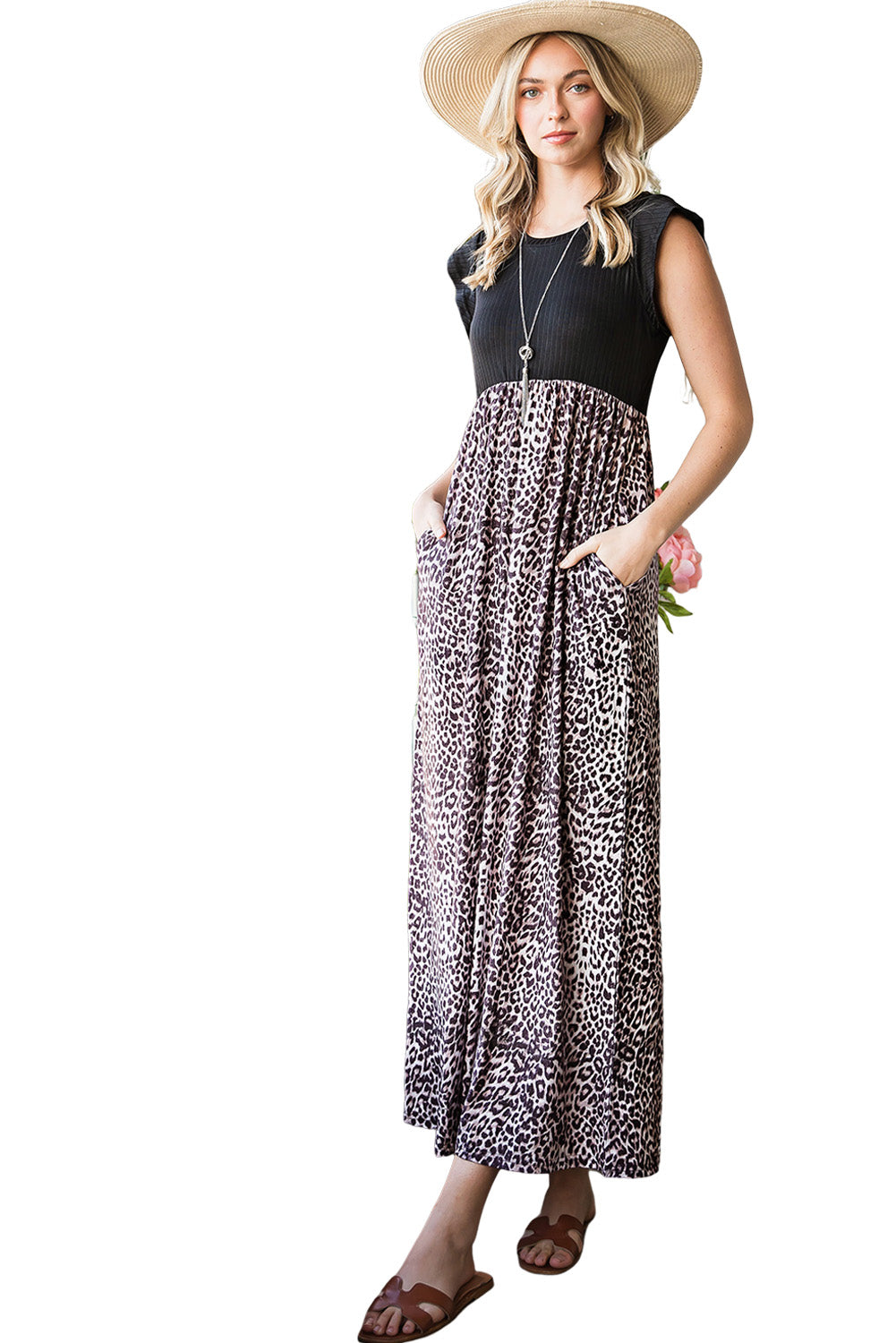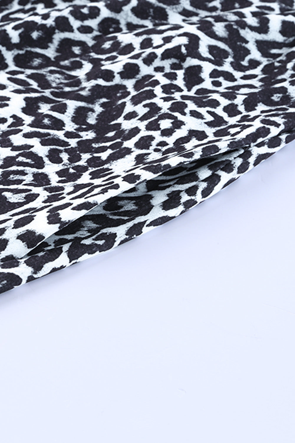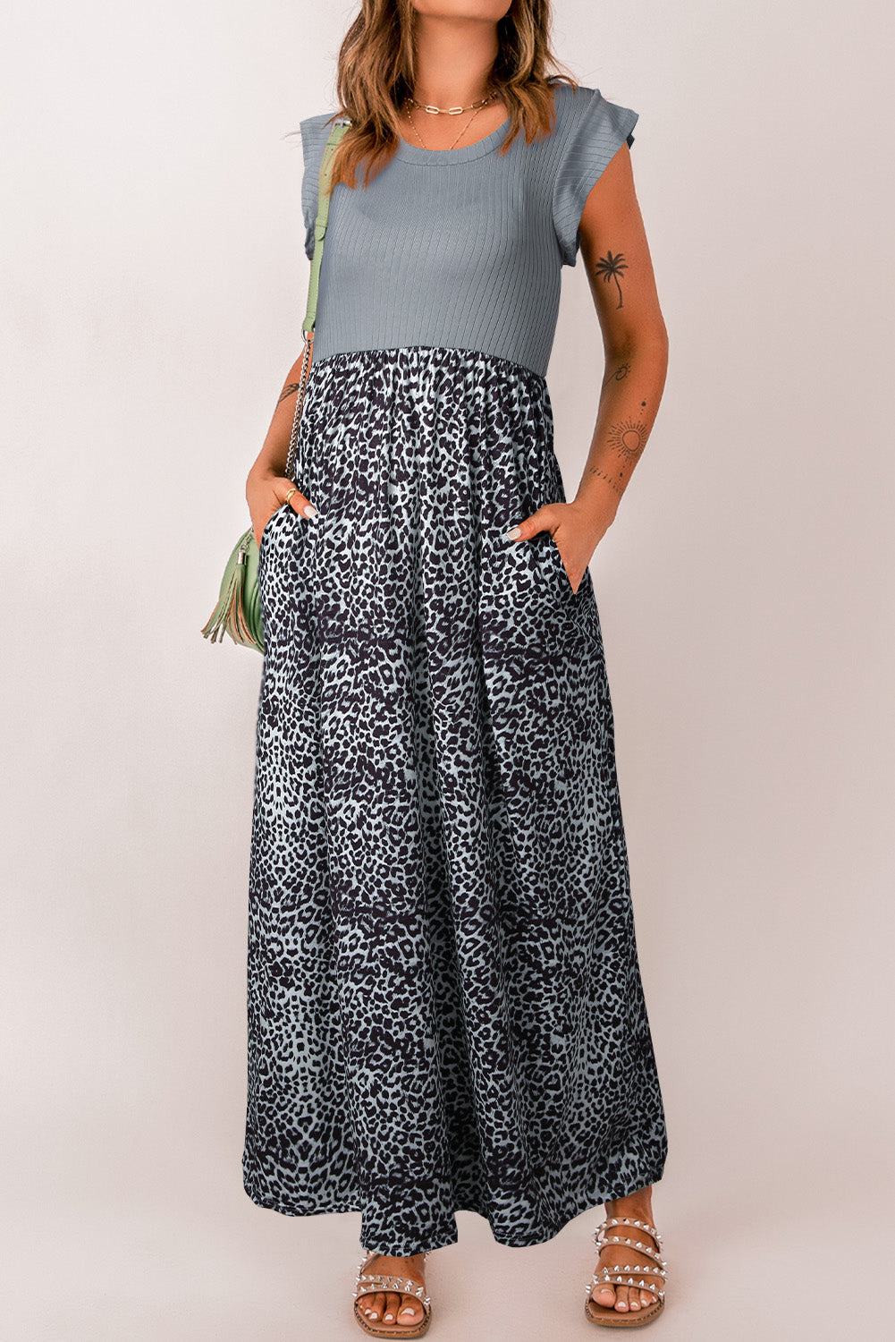 Vestido largo informal con bolsillos y mangas cortas y estampado de leopardo gris